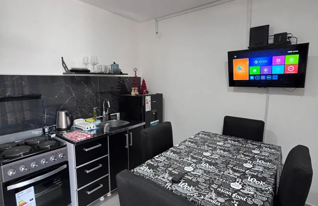 This apartment features an equipped kitchen with a refrigerator and an oven.